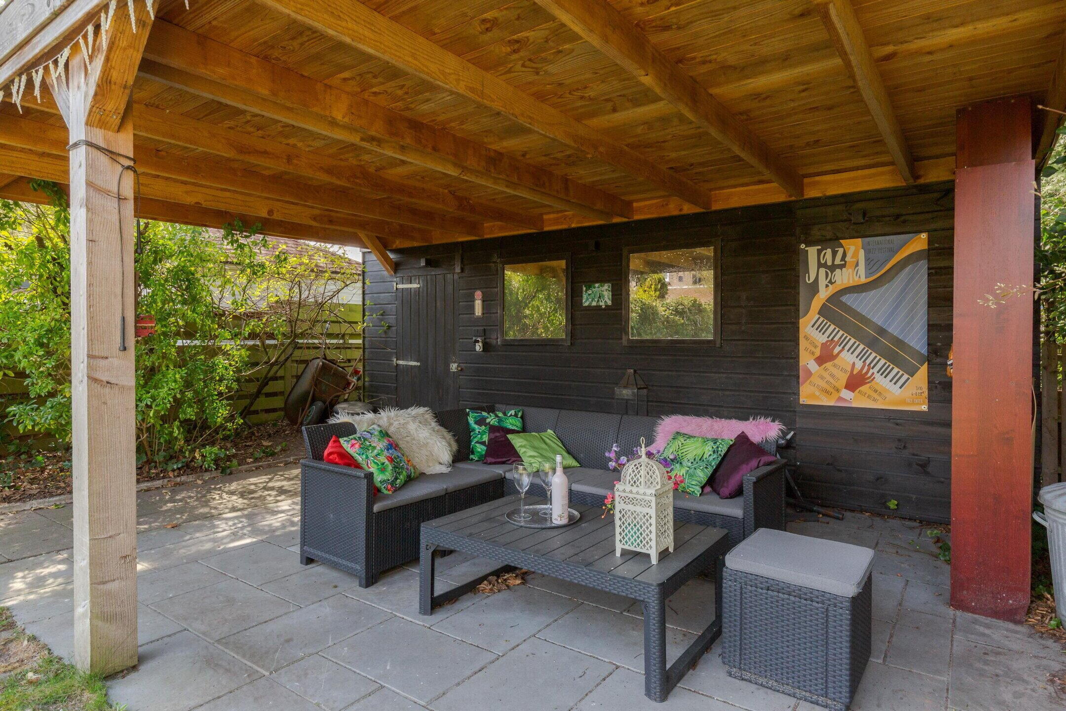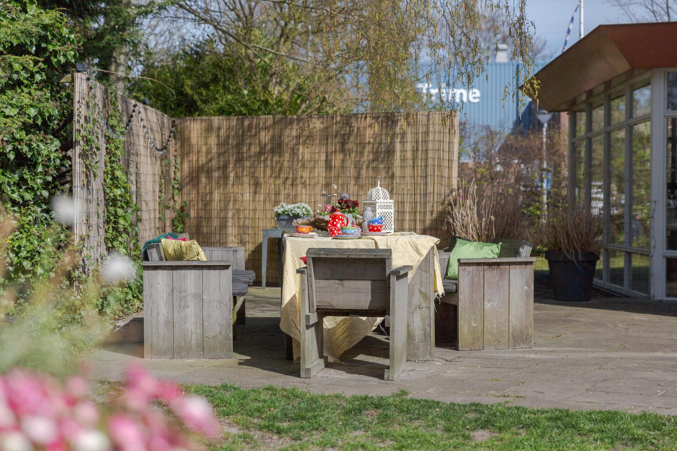 En dan de tuin, wat een paradijsje! helemaal beschut, helemaal privé en altijd wel een plekje in de zon. Hier is het de komende zomers goed vertoeven onder het genot van een hapje en een drankje. Achter in de tuin is de overkapping en nog een flinke fietsenberging.