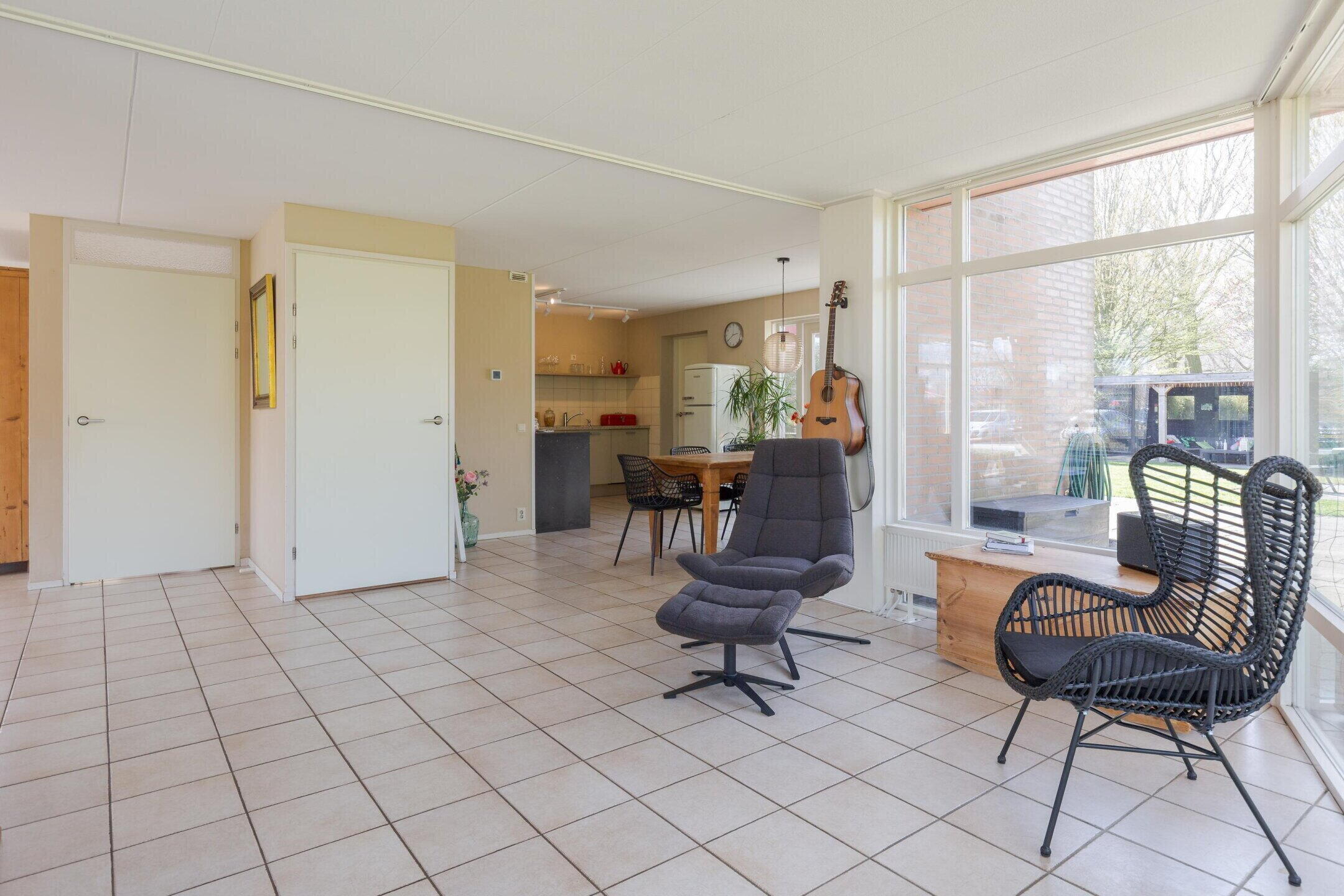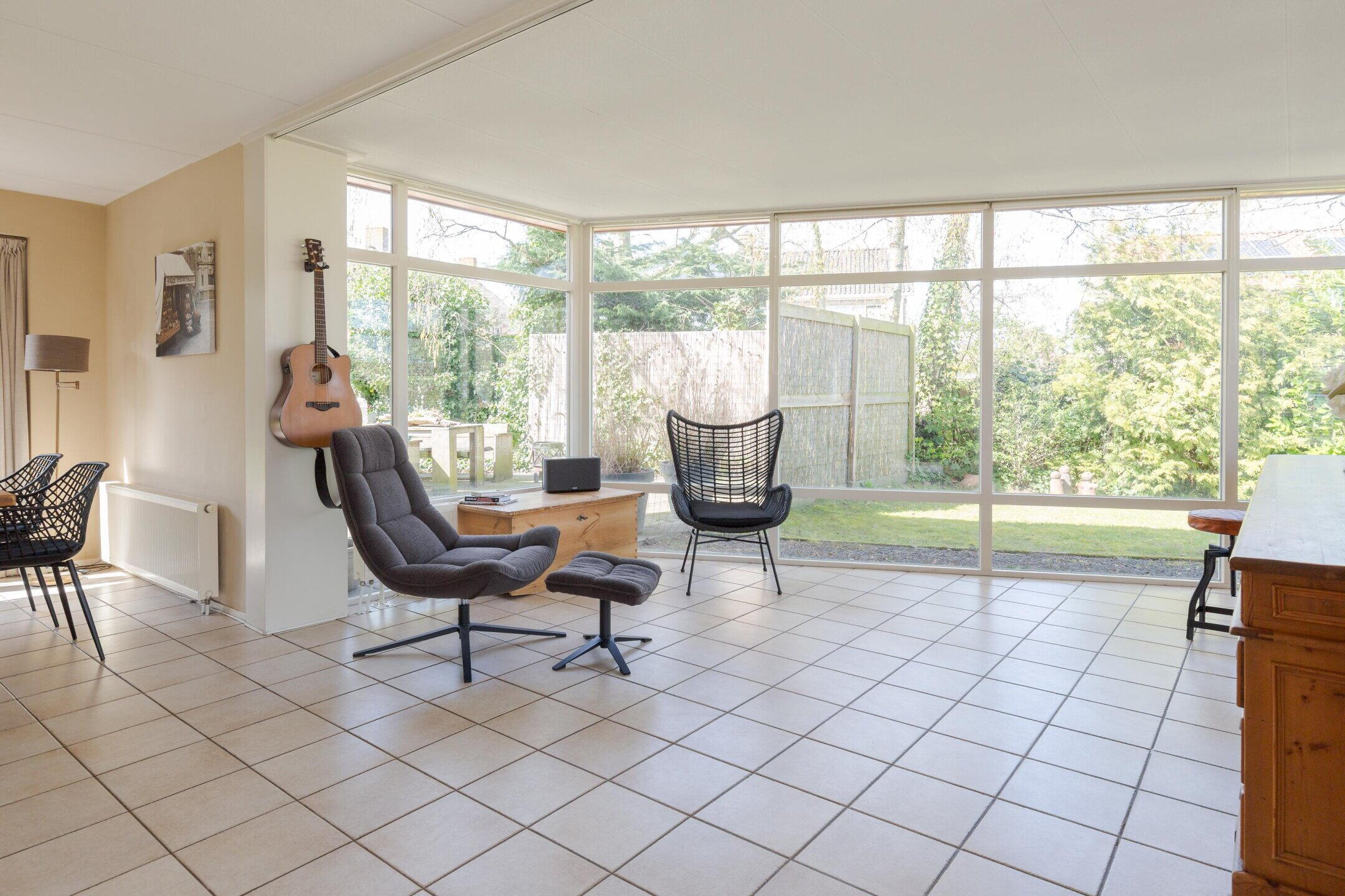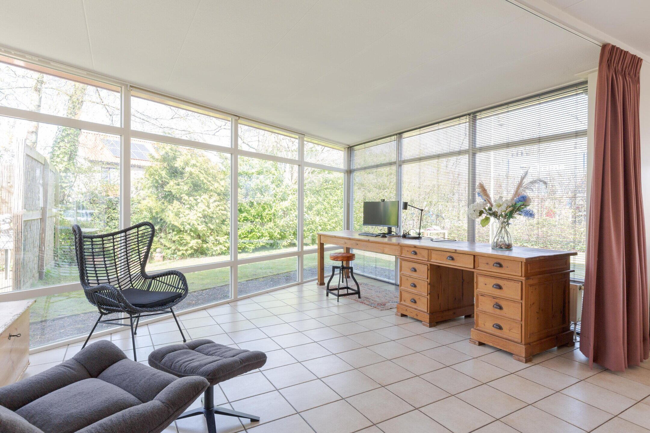 De voormalige garage is omgebouwd tot woonruimte. Dit zou een extra slaapkamer kunnen zijn, maar ook hobby- of praktijkruimte. Aansluitend is er een badkamertje met ligbad+douche en een wastafel, en een forse inloopkast.