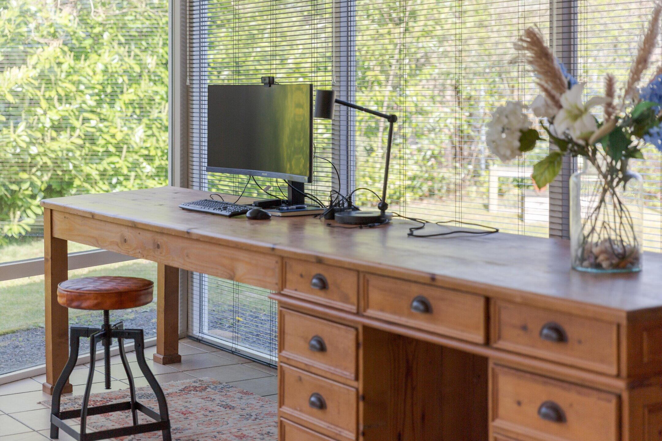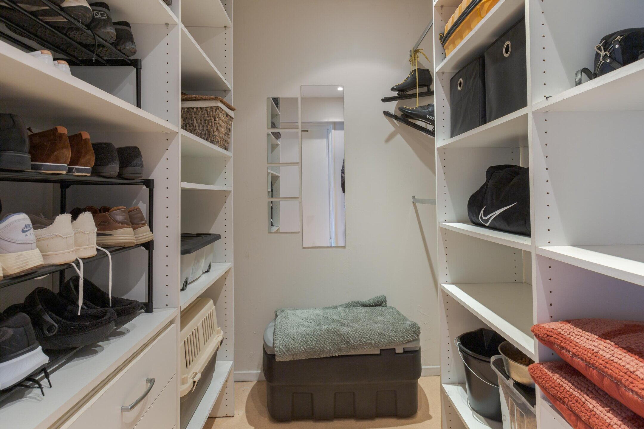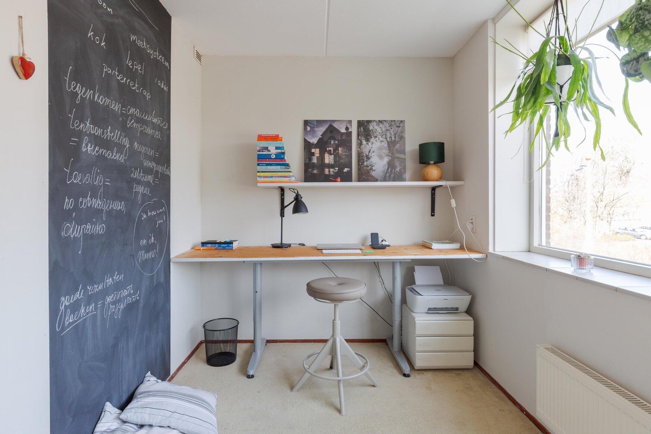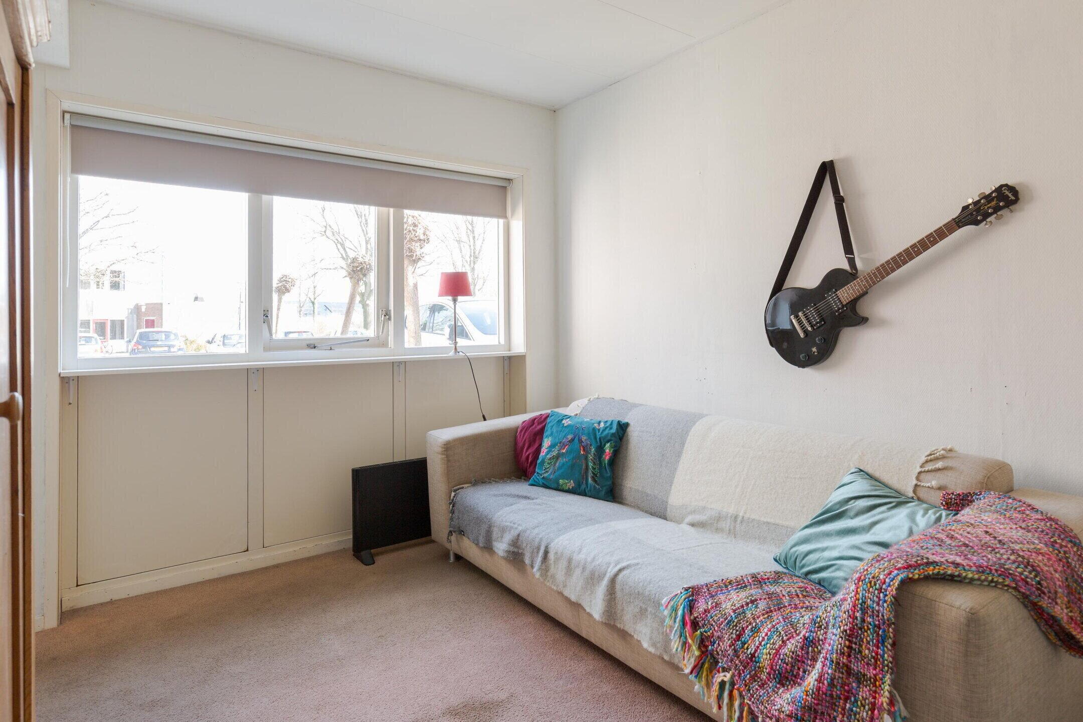 De voormalige garage is omgebouwd tot woonruimte. Dit zou een extra slaapkamer kunnen zijn, maar ook hobby- of praktijkruimte. Aansluitend is er een badkamertje met ligbad+douche en een wastafel, en een forse inloopkast.